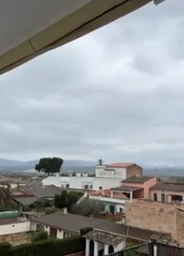 view of a small town from a balcony, under a cloudy sky. The town consists of houses with various colored roofs, including brown, white, and pink. A few trees are visible among the houses, and in the distance, mountains can be seen near what appears to be a body of water. The camera remains static, offering a stationary view of the town.