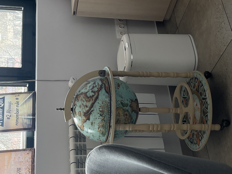The image depicts an indoor scene in Sofia, Bulgaria, focusing on a decorative antique-style globe on a wheeled stand
