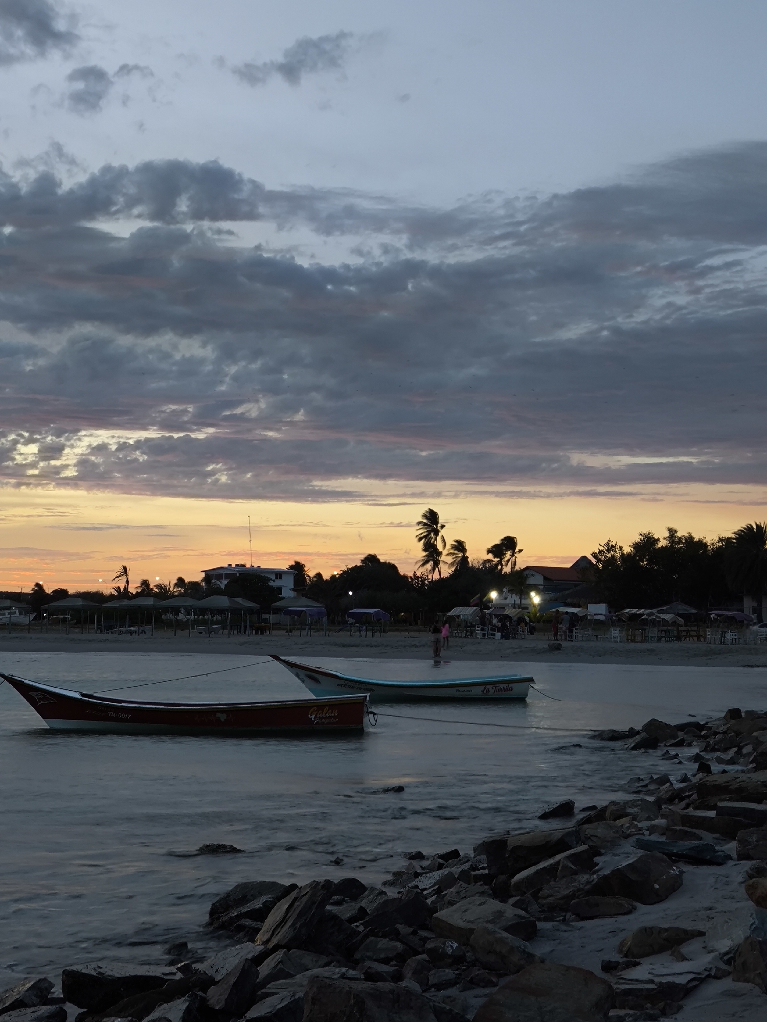 sunset scene at El Yaque beach in Venezuela. The sky is filled with dark, layered clouds and a strip of orange and yellow on the horizon. Two fishing boats are in the foreground, tethered in the water. The closer boat is red and has the word "Galan" written on it. The second boat is light blue. The foreground contains dark rocks, which could be part of a jetty or natural coastline. In the background, there is a sandy beach dotted with umbrellas and beachgoers. Further back, there is vegetation and some buildings with lights on. People are walking on the beach.