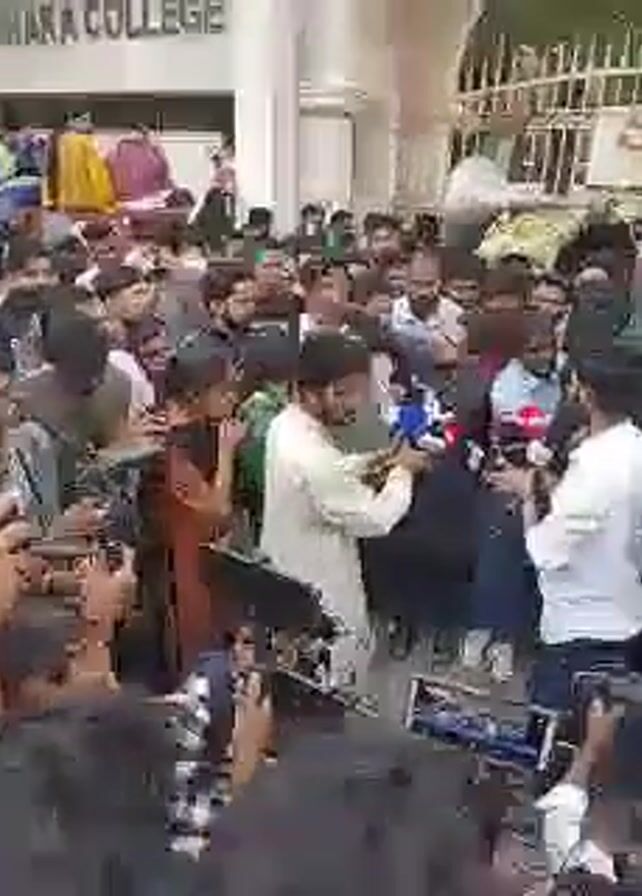The video depicts a dense crowd of people surrounding an individual holding what appears to be a floral arrangement. Many individuals in the crowd are holding up phones, presumably taking pictures or videos. The scene takes place in front of a building with "DHAKA COLLEGE" inscribed on its facade. The crowd is densely packed, with individuals close to each other, creating a somewhat chaotic and congested environment. A security gate is visible behind the crowd.