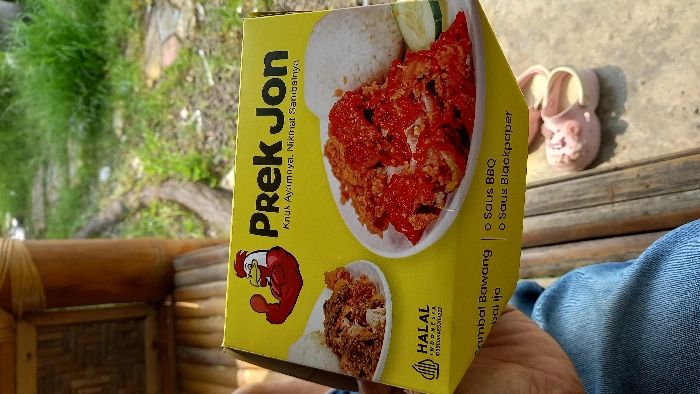 yellow box of "Prek Jon" fried chicken. The box features images of the product, including a main dish of chicken covered in red sauce with rice and a side dish with rice. It mentions, "Knuk Ayamnya. Nikmat Sanibalnya". The sides display "Sambal Bawang", "Bal Ijo", "Saus BBQ", and "Saus Blackpaper", indicating the available sauces. A "HALAL INDONESIA" emblem is visible. The box is held in someone's hand with blue jeans visible. Pink shoes can be seen in the background.