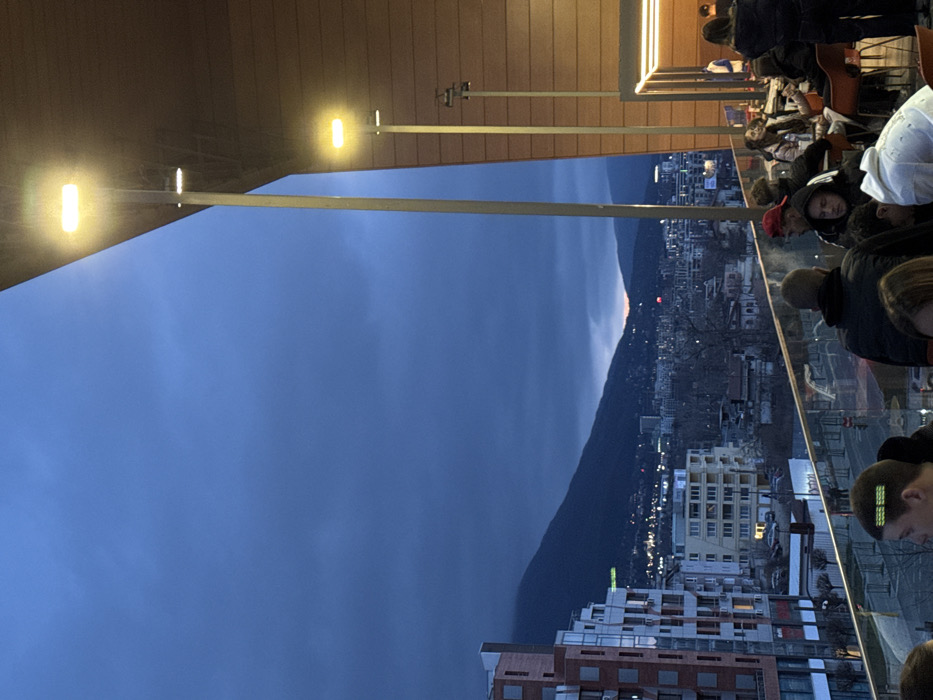 The image depicts an elevated outdoor terrace scene in Sofia, Bulgaria, at dusk or early night, overlooking a cityscape against the backdrop of the Vitosha Mountain range. The sky is dark blue and heavily overcast, with a faint orange glow visible on the distant horizon between mountain peaks. In the background, the silhouette of Vitosha Mountain dominates, with numerous city lights twinkling along its base and slopes. An extensive urban area stretches below, populated with illuminated residential and commercial buildings. A multi-story building with reddish-brown and white facades is prominent on the far left. The terrace, situated in the foreground and mid-ground, features a modern architectural design. An overhead structure with warm, reddish-brown horizontal paneling extends from the right, supported by several vertical, light-colored metallic poles. Each pole is topped with a rectangular LED light fixture emitting a bright, warm yellow glow, illuminating the terrace area. A transparent glass or plexiglass barrier with a metal top railing separates the terrace from the urban vista. Approximately 10-15 individuals, predominantly young adults, are present on the terrace. They are seated at dark tables, occupying orange or reddish-brown chairs. Visible attire includes casual jackets, hoodies, and a red baseball cap. One individual in the immediate lower-left foreground displays a pattern of green pixelated markings on the side of their head. The individuals appear engaged in casual social interactions, with some looking towards the view or at objects not explicitly visible. No specific actions such as eating or drinking are definitively discernible.
