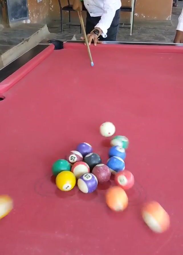 A person in a white shirt breaks a rack of pool balls on a red pool table. The cue ball hits the rack, scattering the numbered pool balls across the table. The pool table has a colorful design on the lower part, visible on one side. Two men wearing white shirts are visible in the frame, standing on either side of the table. In the background, a person is sitting at a bar. The environment suggests a bar or recreational area.