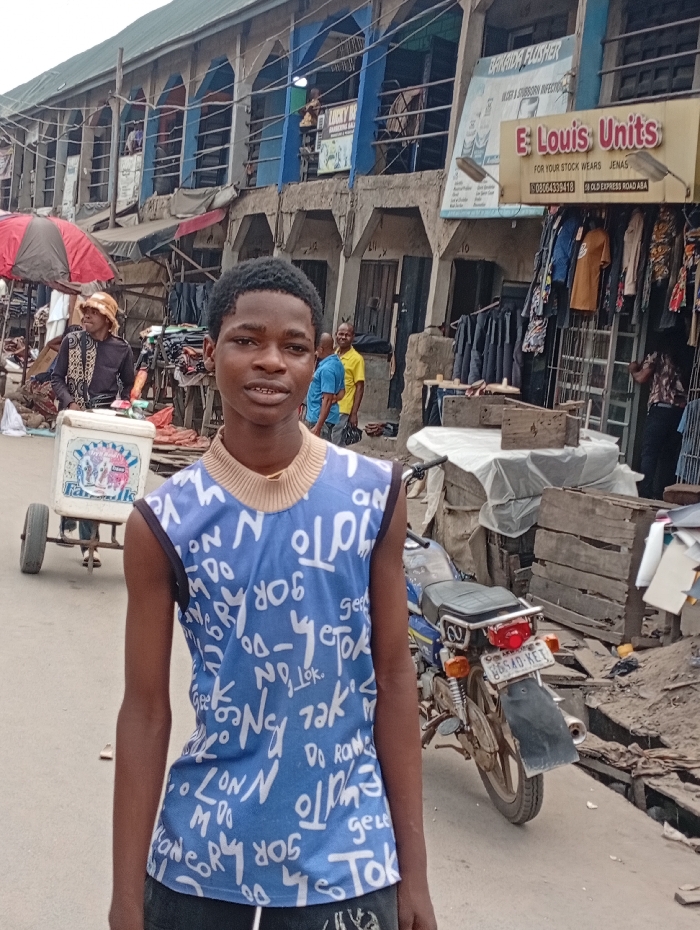 A young dark-skinned male, approximately 15-20 years old, with short, dark, curly hair, stands in the foreground, looking directly at the camera