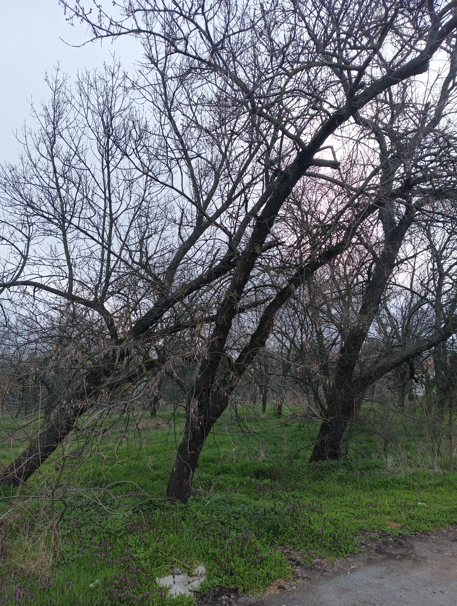 The image depicts an outdoor scene within the city of Karnobat, Bulgaria. The environment consists of a dense grove of deciduous trees with dark, gnarled, bare branches extending upwards and across the frame against an overcast, light grey sky. Some branches exhibit nascent buds and dried catkins or seed pods. The ground is covered by vibrant green grass and extensive patches of low-lying purple flowering plants, likely in late winter or early spring. A dirt or gravel path is visible in the lower right foreground, partially obscuring the vegetation. A small, light-colored concrete or stone fragment is embedded in the grass near the path. No people or specific actions are visible.