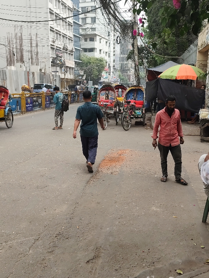 An urban street scene in Dhaka, Bangladesh, viewed from a low angle, depicts multiple individuals, vehicles, and structures under an overcast sky