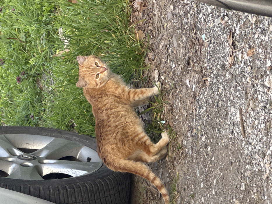 A lean, orange tabby cat with distinct darker stripes stands on a gravel and dirt ground surface, looking directly forward. Its eyes are light amber, and its ears display minor irregularities. The cat's posture suggests observation. To the immediate left, a portion of a silver car wheel and a black tire are visible. Behind the cat, a dense patch of green grass and weeds extends. The ground cover consists of various sized light-colored gravel, dirt, and scattered dry leaves. This outdoor scene is situated within Plovdiv, Bulgaria; however, no specific city landmarks are present to identify an exact location.