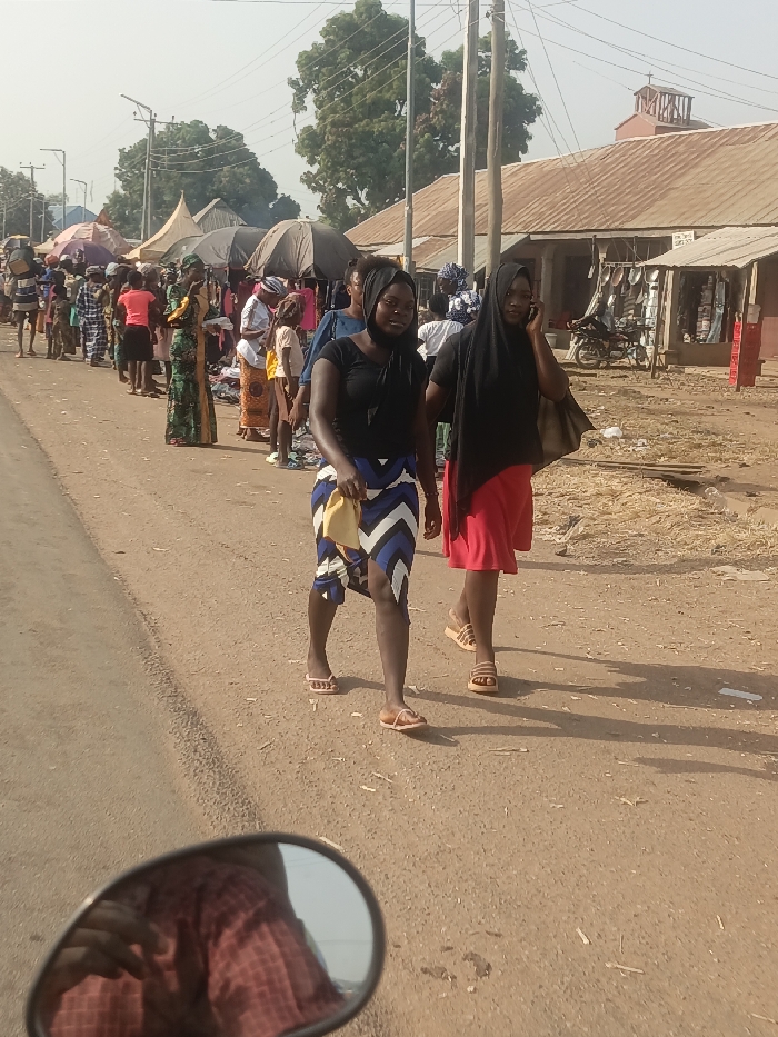Two women walk along a dusty road in front of a bustling outdoor market. The woman on the left wears a black top and a blue and white patterned skirt, while the woman on the right is draped in a black headscarf and a red skirt. People mill about amidst temporary stalls, umbrellas, and simple structures. In the background, a motorcycle is parked next to a building with a corrugated metal roof. The bottom of the image features a side mirror reflecting a person wearing a red checkered shirt.