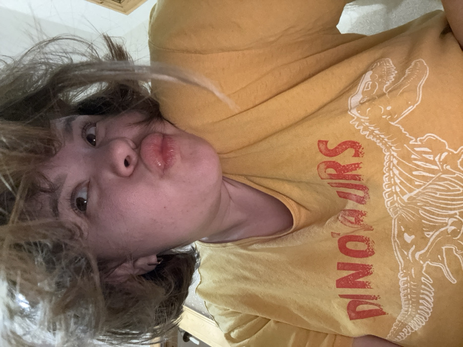 The image presents a close-up, low-angle shot of an individual, likely female, with light brown, short, disheveled hair and a light complexion. The subject is looking upward and to the right of the frame, with her lips pursed in a "duck face" expression, cheeks slightly puffed, and visible gloss on her lips. A small, silver-colored hoop earring is present in her left ear. She is wearing a mustard yellow t-shirt. The shirt features a red, distressed print of the word "DINOSAURS" across the chest, with a white outline illustration of a bipedal dinosaur skeleton beneath it. The background is out of focus, indicating an indoor setting with a light-colored, possibly wood-paneled surface partially visible on the left and a plain, light-colored wall or surface on the right. No identifying features within the image allow for the determination of the specific location within Nizhnekamsk, Russia.