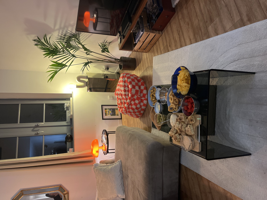 This image depicts a residential living room in Roubaix, France, during evening or nighttime conditions, evidenced by the illumination from internal light sources and the visible darkness outside a large, multi-pane window with light gray frames on the left wall. The room features light-colored walls and a light wood-tone floor. In the foreground, a low, rectangular black glass coffee table is centered on a light-colored, possibly cream-colored, area rug. The table holds a variety of snacks: a wooden cutting board with cut pieces of focaccia bread and a light-colored dip, alongside several bowls containing green olives, roasted peanuts, small ring-shaped baked goods (taralli), a metal bowl of cherry tomatoes, and a blue bowl filled with yellow potato chips. To the left, a section of a light brown, ribbed corduroy sectional sofa with a white throw pillow is visible. A small, black round side table next to the sofa supports an illuminated orange, mushroom-shaped table lamp. On the wall above the sofa, an ornate gold-framed mirror reflects the upper torso, head, and an arm of an individual, possibly holding a mobile phone, indicating the presence of at least one person. In the mid-ground, a red and white checkered, textured pouf or ottoman rests on the floor. To the right, a tall, green potted plant is positioned next to a low-set wooden media console. A large, dark flat-screen television sits on this console, with a distinct reflection of an orange mushroom-shaped lamp (similar to the one on the left) visible on its screen. The console features a wooden crate serving as storage and a reddish-brown drawer or box beneath the television. Between the plant and the window, a tall, slender mirrored cabinet or pedestal is topped with an S-shaped white lamp emitting a warm glow. A small, framed picture with an abstract design leans against the wall below the window. No direct human actions or interactions are depicted, beyond the reflected individual.