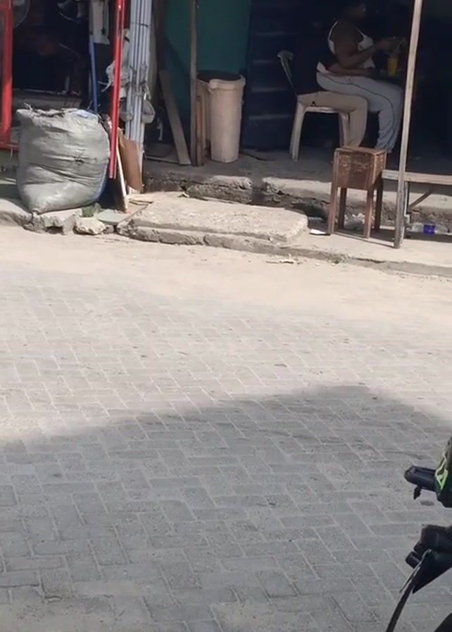street scene. A white van with "EDUCATION" and phone numbers is parked on the side of the road. Next to the van, a person is sitting on a chair outside what looks like a small shop or storage area. The environment appears to be an urban or semi-urban setting with a paved road and some visible structures.