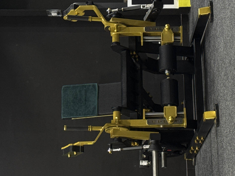 A piece of exercise equipment is situated against a wall. It's constructed from black and gold components, presenting a structured appearance. The machine has a seat with a dark-colored cushion and a green towel placed on it. Other elements include rollers and a handle, adding to its functionality. The machine is set up in what seems to be a home gym setting, with a dark background and a visible wall, implying an indoor workout space.