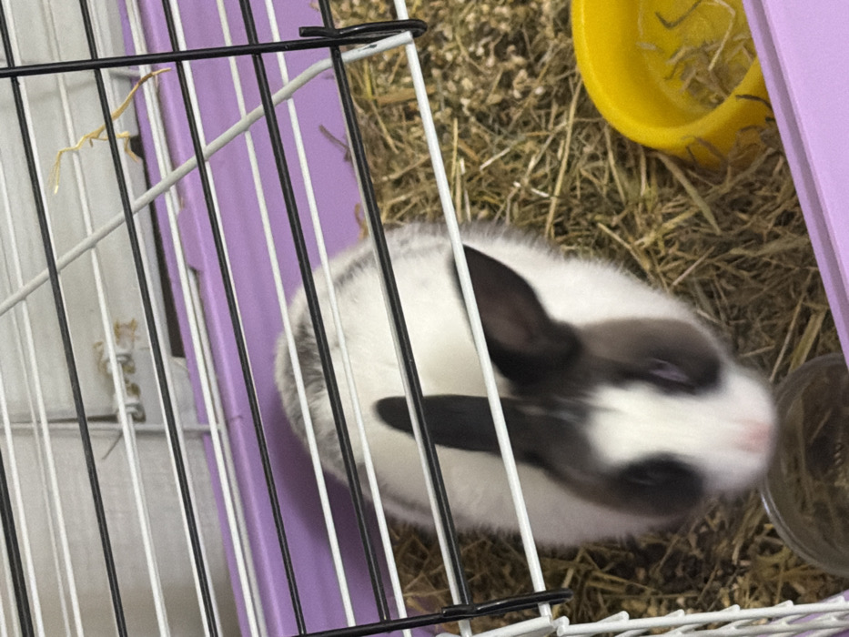 The image, taken in Stara Zagora, Bulgaria, displays a small domestic rabbit contained within a wire enclosure. The rabbit possesses primarily white fur with prominent black markings on its ears and around its eyes, and a greyish area on its back. Its face exhibits slight motion blur, suggesting movement. The enclosure features a lavender-purple plastic base and a cage constructed from white and black metal bars. The cage floor is covered with a thick layer of dry hay or straw. Within the cage, a bright yellow plastic bowl containing scattered hay is visible on the right, and a clear, round dish is partially visible in the bottom-left foreground. No human subjects are present.