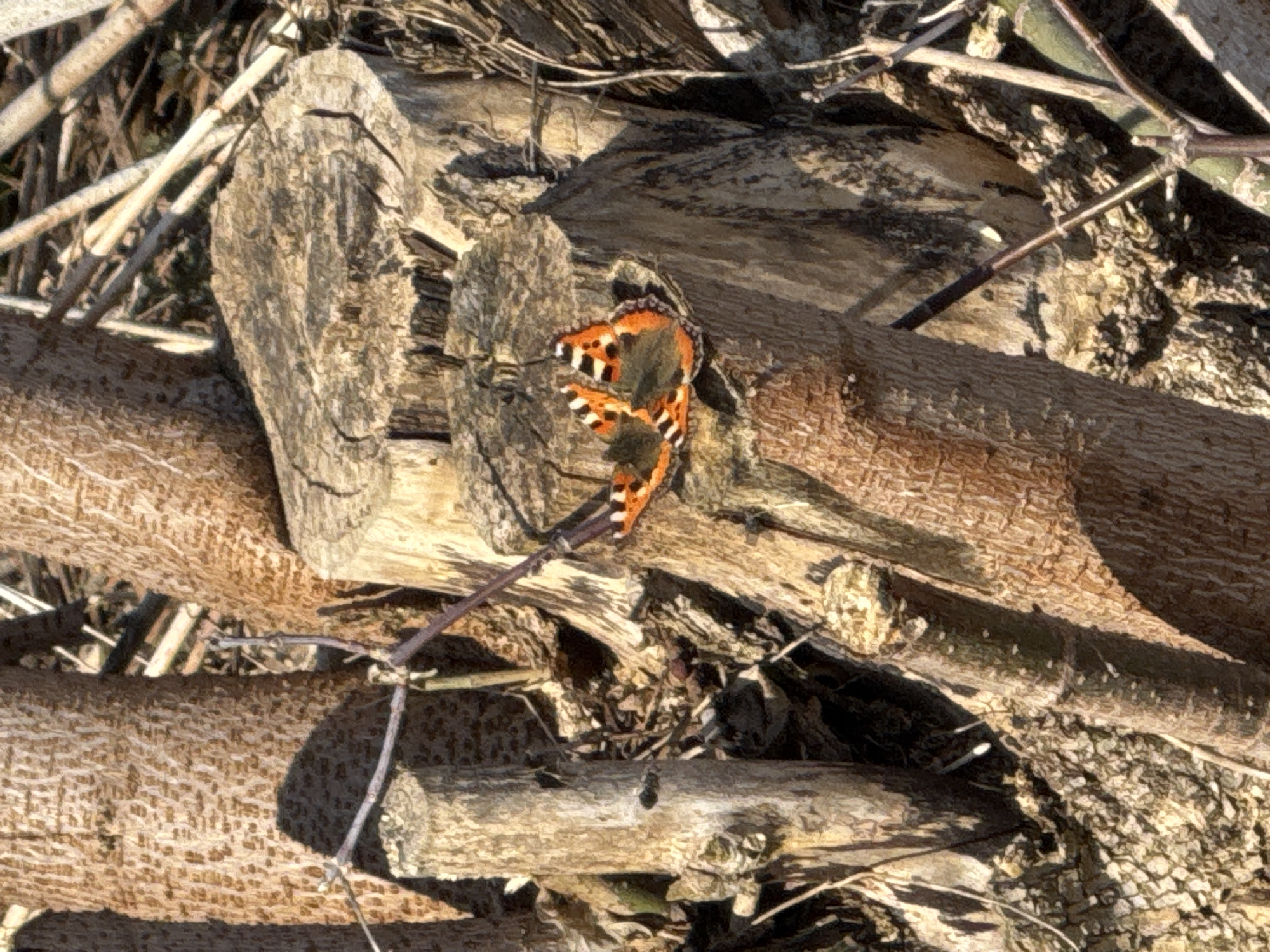 - "The image depicts a butterfly, presumably a tortoiseshell or similar species, perched on a felled tree limb or log" by FM-L48Wm1, licensed under CC BY 4.0