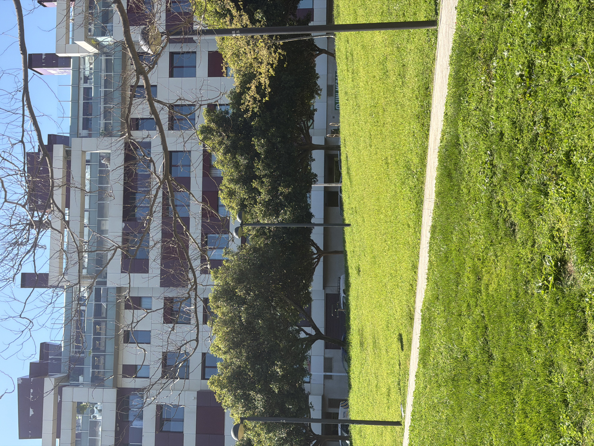 The image captures an outdoor urban scene in Mislata, Spain, under clear daylight conditions. In the foreground, a vibrant green lawn occupies the lower half of the frame. A light-colored paved pathway extends from the lower left corner towards the mid-right. Several black, pole-mounted streetlights with spherical fixtures are visible, positioned along the pathway and further back. Bare tree branches, devoid of leaves, extend across the upper portion of the frame, partially obscuring the background building. The mid-ground features a row of dense, evergreen trees with full green foliage, situated behind the lawn and streetlights. Beyond these trees, a paved area separates them from the building. Partially visible vehicles include a white van bearing the word "SADIVAL" on its side and a white sport utility vehicle with a roof rack. A green sign with white text, partially obscured, is visible behind a tree. Two indistinct individuals are observed walking in the paved area at the base of the building; one wears a light-colored top. The background is dominated by a multi-story residential building featuring a modern architectural design. Its façade consists of alternating white and dark maroon/red rectangular panels. Numerous windows, some reflecting the blue sky, are present across the building's surface. Several balconies with transparent glass railings are visible. On an upper-level balcony, a light-colored object or individual is discernible, appearing to be seated. Another balcony to the right contains visible patio furniture, including chairs and a table. The building's rooftop displays several integrated structures. The sky above is clear and blue.