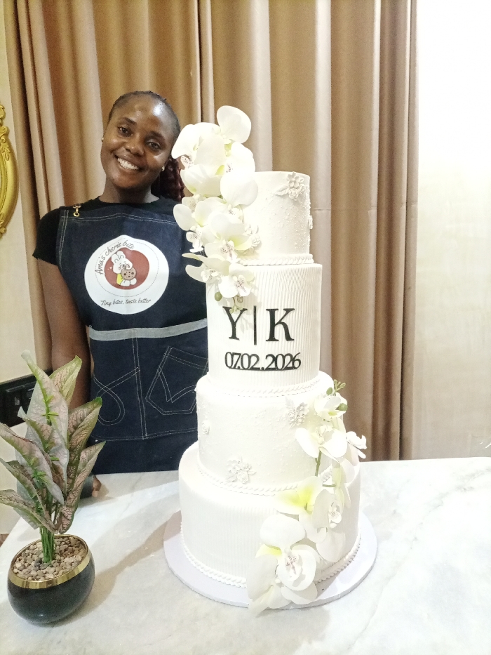A woman in a denim apron stands behind a white, four-tiered wedding cake adorned with white orchids. The cake displays "Y|K" and "07.02.2026" in black lettering. A small potted plant with variegated leaves sits on the table to the left. Beige curtains form the backdrop. The woman is smiling and looking at the camera. A gold-framed mirror is visible in the left corner.