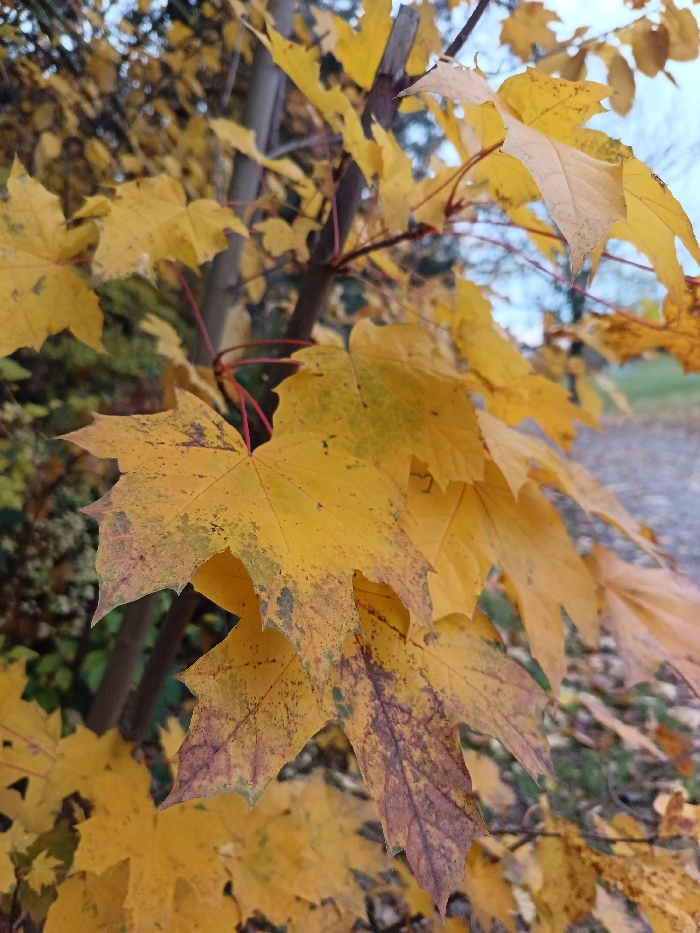 The image depicts a close-up view of autumn leaves on a tree in Kamenz - Kamjenc, Germany. The primary subjects are several maple-like leaves, predominantly bright yellow in color, with visible green and brown discoloration in the form of spots and blotches, indicating the process of senescence. The leaves exhibit a five-lobed structure with serrated margins, and distinct venation is present. Reddish petioles connect the leaves to the brown branches of the tree. The background is out of focus, showing additional yellow and green foliage, suggesting a wooded or park environment. A light blue-grey sky is faintly visible through the upper right foliage. The ground in the far right background appears to be a blurred gravel or dirt path. No people or specific actions are depicted.