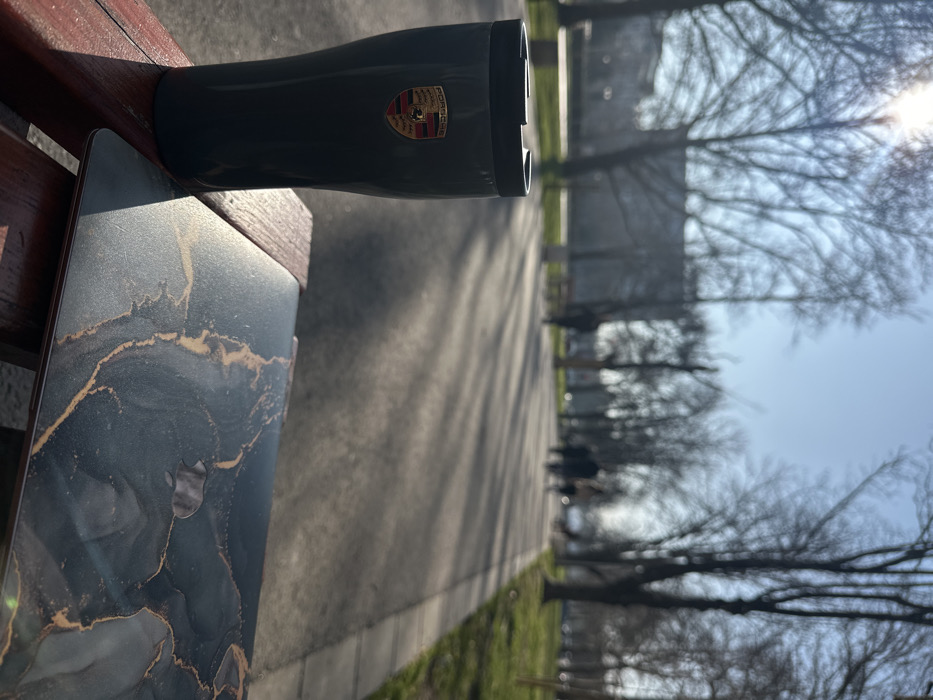 The scene depicts an outdoor park or garden promenade in Plovdiv, Bulgaria, consistent with Tsar Simeon's Garden, under clear skies on a bright, sunny day. In the immediate foreground, a dark grey travel mug, bearing a colored Porsche crest logo, rests on a dark reddish-brown slatted wooden surface. Adjacent to the mug, a closed laptop with a black and gold marbled patterned lid, featuring an Apple logo cutout, is also visible on the same surface. A strong sun glare originates from the upper-left of the frame, illuminating the foreground objects and casting long shadows across the scene. The midground features a wide paved pathway lined by bare-branched trees and sections of green grass. Multiple indistinct figures, appearing to be pedestrians, are visible walking along this pathway. The background, largely obscured by trees, reveals blurry outlines of distant buildings beneath a clear blue sky.