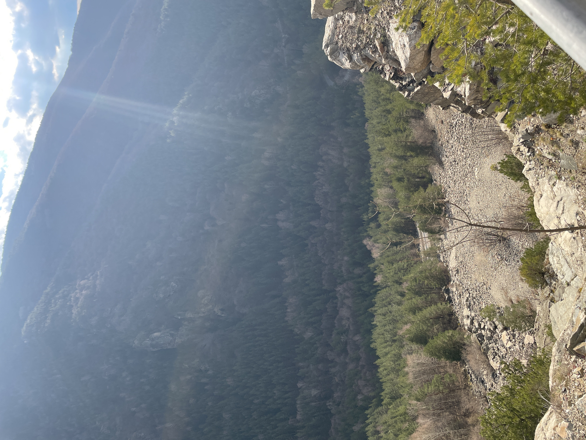 view from a rocky precipice, looking down into a valley. The left side of the image shows a mountainside covered in a hazy, dense forest. On the right, the foreground features rocky terrain with sparse vegetation and trees clinging to the cliff edge. A gully runs down from the cliff, filled with loose rock and scree, flanked by more trees. The location is Sapareva Banya, Bulgaria.