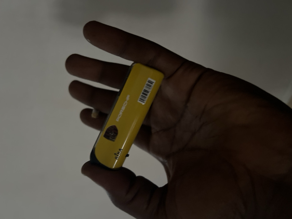 A dark-skinned human hand is captured in a close-up, holding a yellow electronic device against a plain, light-colored background. The device, resembling a disposable vape pen, features a black tip and is inscribed with "NIMA" in white text on the left, followed by a Porsche crest logo, and "PORSCHP" in white capital letters to its right. A white barcode is visible near the bottom right of the device. A light-colored cylindrical object, consistent with a rolled item or cigarette, is partially visible between the subject's index and middle fingers. The background is an indistinct, uniformly light-colored wall, offering no specific identifiers for a location within Lokoja, Nigeria. The scene is dimly lit.