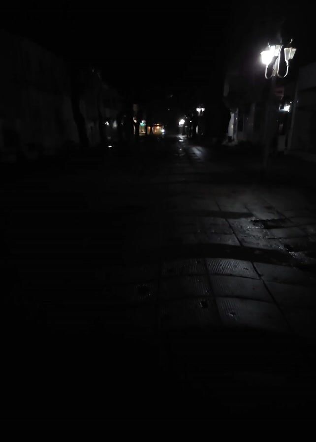 dimly lit street at night. The street is paved with rectangular tiles and appears to be wet in places. Streetlights cast faint illumination, creating long shadows. Buildings line both sides of the street, but details are obscured by the darkness. A vehicle can be seen in the distance. The scene is dark and quiet.