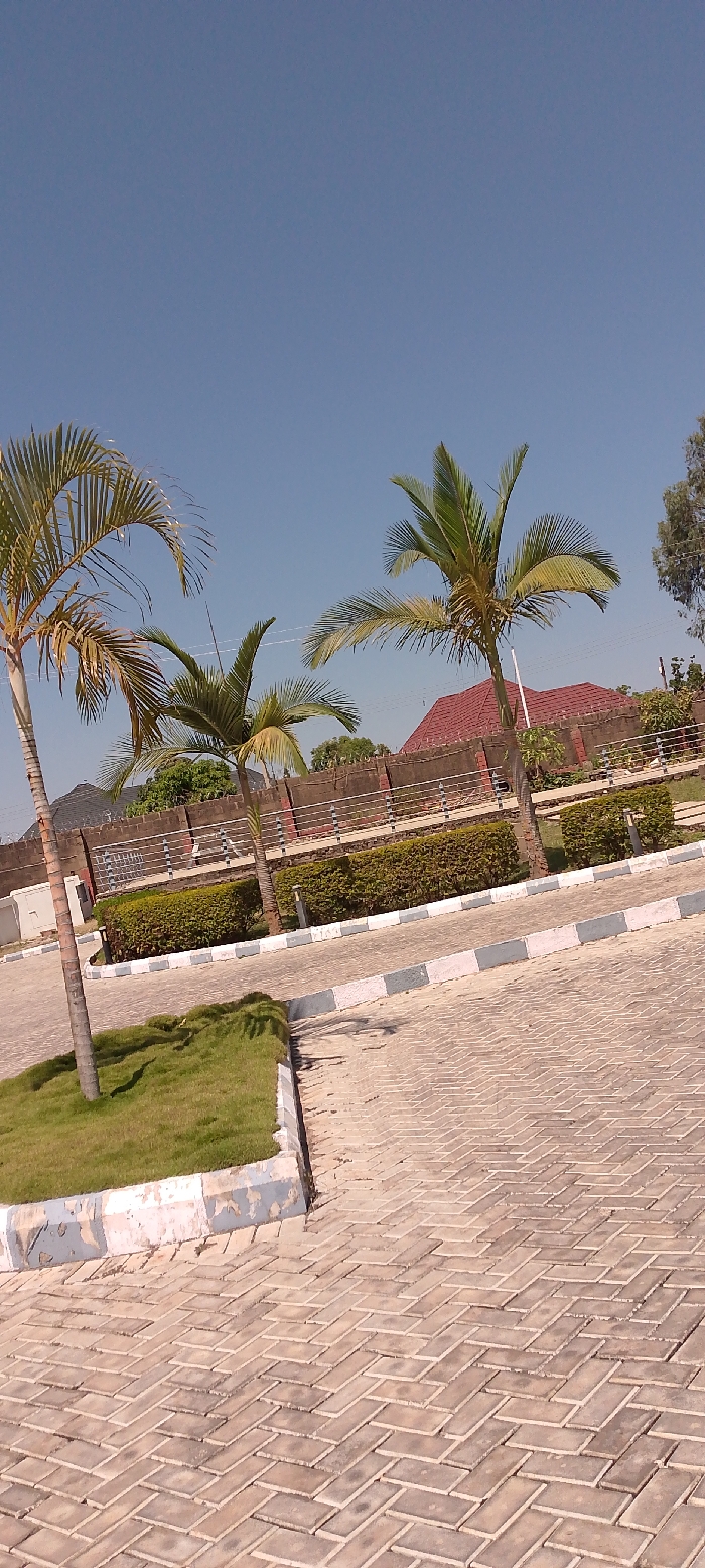 An outdoor scene in Jos, Nigeria, is depicted under a clear, bright blue sky