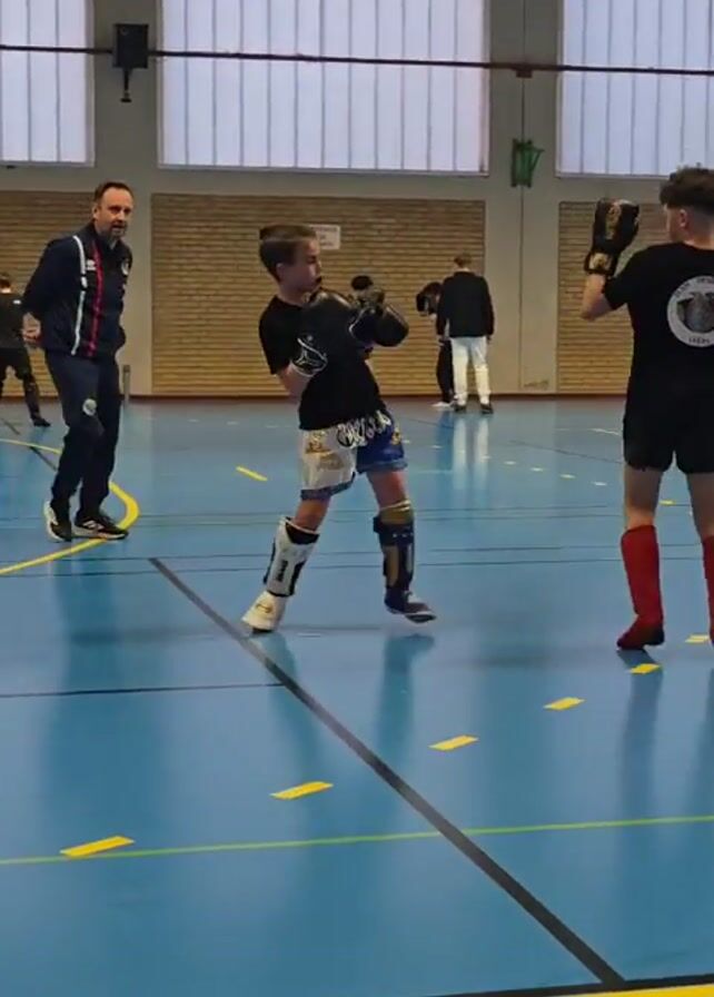 - "In a brightly lit indoor sports hall with a polished blue floor marked with yellow lines, two young boys engage in what appears to be a martial arts sparring session" by FM-dTRWD3, licensed under CC BY 4.0