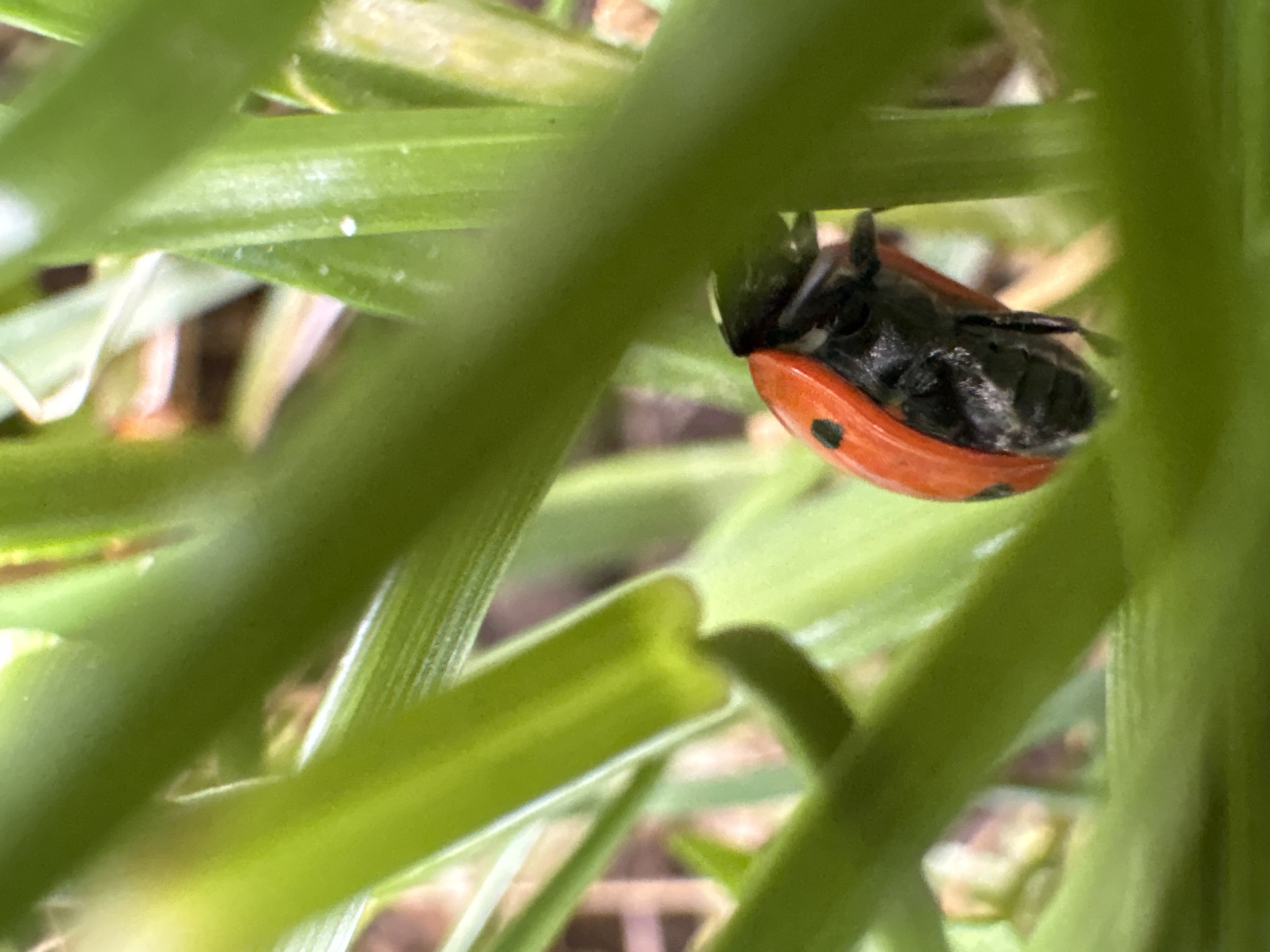 A close-up shot shows a ladybug clinging to a blade of green grass. The ladybug has a black head and body with a bright red shell featuring black spots. The grass blades are in focus, creating a blurred background. The location is in Unknown, Unknown.