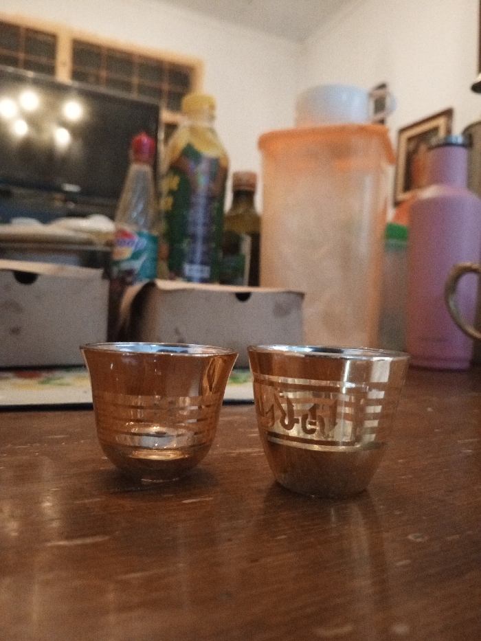 The image presents an indoor scene in Longmiang, Laos, featuring two decorative gold-colored cups on a dark brown wooden table in the foreground. The cup on the left exhibits several horizontal gold bands, while the cup on the right displays similar bands along with stylized gold Arabic calligraphy on its side. Both cups possess reflective silver interiors. Behind the cups, a partial view of a white and green patterned mat is visible on the table. The background is out of focus, revealing a cluttered shelf or surface. Notable objects in the blurred background include a television screen reflecting multiple light sources, a window frame with horizontal wooden slats, a slender clear bottle with a red cap, a taller clear bottle with a yellow cap, a dark glass bottle, a large opaque light orange plastic container with a white lid, a light pink bottle, and a partial view of a gold-colored handle from another vessel. The wall behind these items is light-colored. No individuals are present, and no direct actions or interactions are depicted.