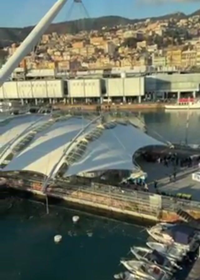 harbor scene. In the foreground, several small white motorboats are docked at a wooden pier. Behind the pier, there is a large white structure resembling a canopy or tent, supported by a series of white poles. People are visible underneath this structure, but their actions are not clearly discernible due to the distance. In the background, there is a city built on a hillside, with buildings of various colors and styles. The sky is blue with a few scattered clouds, suggesting a sunny day. The camera appears to be positioned at an elevated viewpoint, possibly from a building or a tall structure overlooking the harbor.