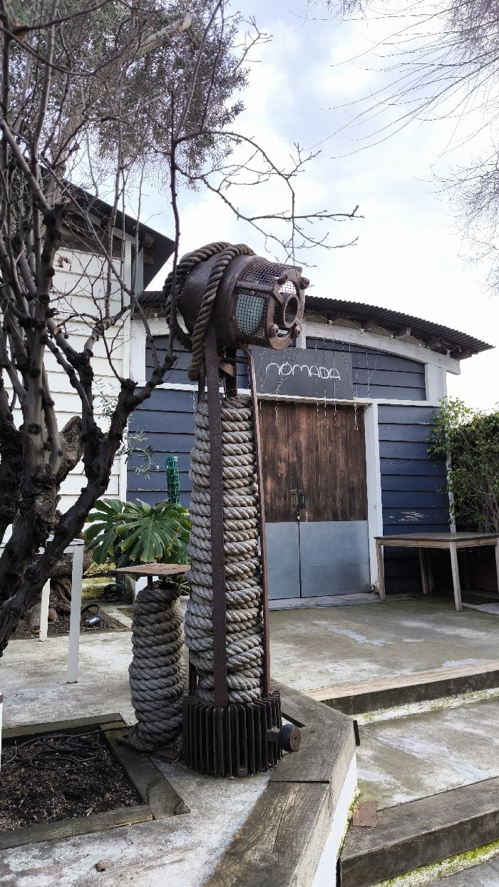 A nautical-themed sculpture stands prominently, featuring a diving helmet encircled by rope atop a column of tightly coiled ropes. The column rests on a metal base with vertical fins. Behind, a rustic building is painted blue and white with a dark wooden door labeled "Nómada." Bare trees frame the scene, adding to the somewhat desolate, yet artistic atmosphere. Concrete steps lead up to the building's entrance.