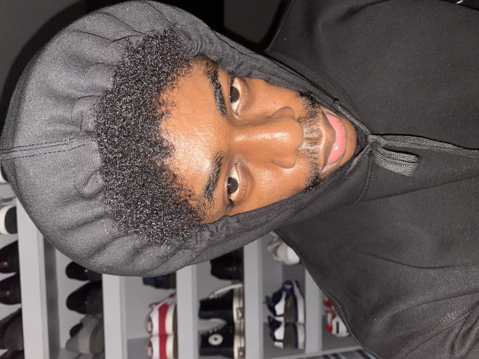 An individual is depicted in a close-up, head-and-shoulders portrait shot indoors. The person is an adult male with a dark skin tone, short dark curly hair visible at the forehead, and a short beard/stubble on the chin and upper lip. He is wearing a dark, likely black, hooded sweatshirt with the hood pulled over his head; the drawstrings are visible at the front. His eyes are open and directed forward, and his mouth is slightly agape. The background consists of white shelving units containing multiple pairs of shoes and sneakers of various designs and colors, indicating an organized storage area. The exact location within Igboefon, Nigeria, cannot be determined from the visual information provided.