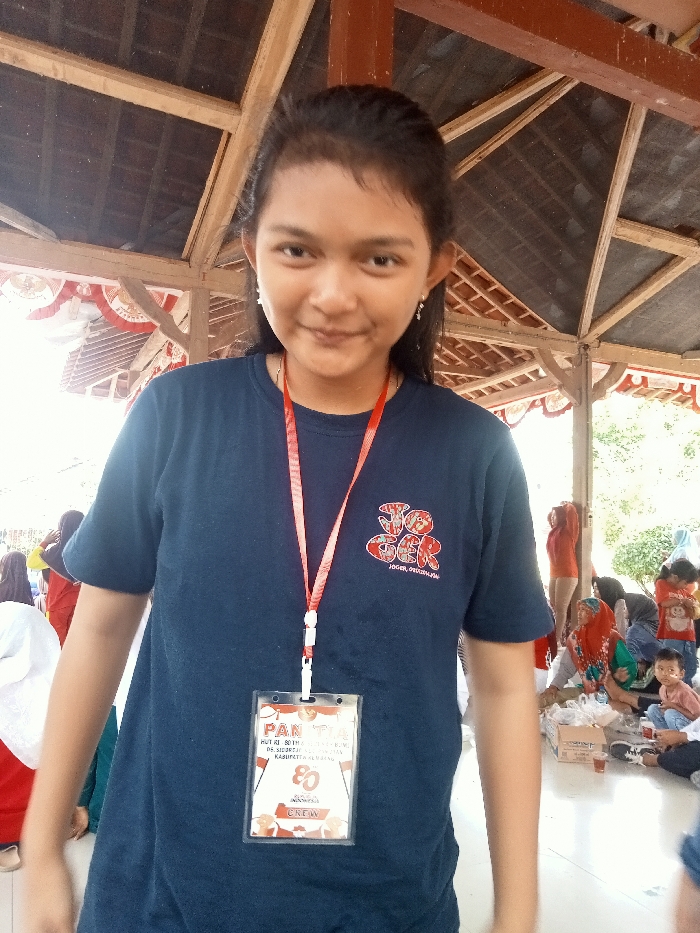 A young female, likely of Indonesian ethnicity, stands centrally in a medium shot, facing the camera with a polite smile. She wears a dark blue short-sleeved t-shirt with a red and white "JOGER" logo on the left chest. Around her neck is a red lanyard holding a clear plastic ID badge, which is white with red accents. The badge explicitly states "PANITIA" (Committee) and identifies the event as the "HUT RI 80th" (80th Anniversary of the Republic of Indonesia) in "DS. SIDOREJO" (Sidorejo Village), Rembang Regency, Indonesia. Her dark hair is pulled back, and she wears small earrings. The scene is set within an open-sided wooden pavilion featuring exposed beams and a dark mesh undersurface. Red and white decorative bunting, matching Indonesian national colors, hangs from the wooden structure. In the background, to the right, several adults and children are seated on the ground, some wearing headscarves. White bags and cardboard boxes are visible near the seated individuals. The environment is brightly lit, indicating a daytime outdoor or semi-outdoor setting.