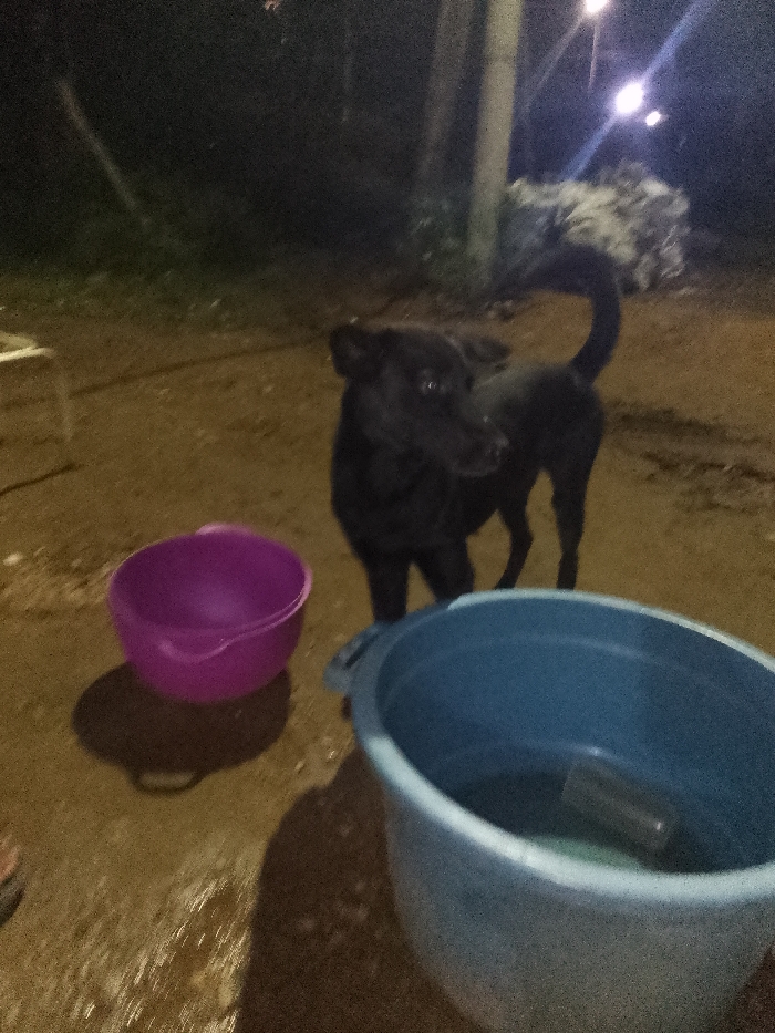 A black dog stands alertly on a brown surface, possibly dirt or pavement. A purple bucket sits to the left, while a larger, light blue bucket with water in it is on the right, reflecting the scene. A cylindrical object rests at the bottom of the blue bucket. The background is dark, with a blurred light source and what appears to be a pole. The overall lighting is dim, suggesting it's nighttime.
