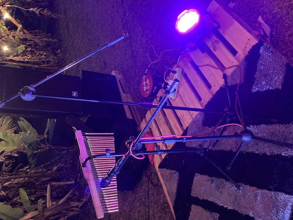 The image depicts an outdoor musical performance setup at night in Murera ward, Kenya. The scene is illuminated by artificial purple-pink lighting. In the foreground, a black and grey patterned rug lies on grassy ground. Two microphone stands are positioned on the rug. One stand supports a microphone aimed at a set of wooden-topped bar chimes with metallic tubes. A second boom microphone stand extends diagonally across the frame. Red audio cables are visible on the ground and wrapped around the stands. In the midground, a stack of two black "EV" (Electro-Voice) branded speaker cabinets rests on wooden pallets. To the right, another wooden pallet serves as a platform for a red power reel and a multi-outlet power strip with various cables connected. Adjacent to these power components, a round LED stage light emits a bright purple-pink beam. The background features dense, dark foliage, consistent with banana plants or similar large-leaved vegetation. Faint, warm-white string lights are visible strung among the trees in the upper right portion of the background, contributing to the ambient lighting. No individuals are present in the scene.