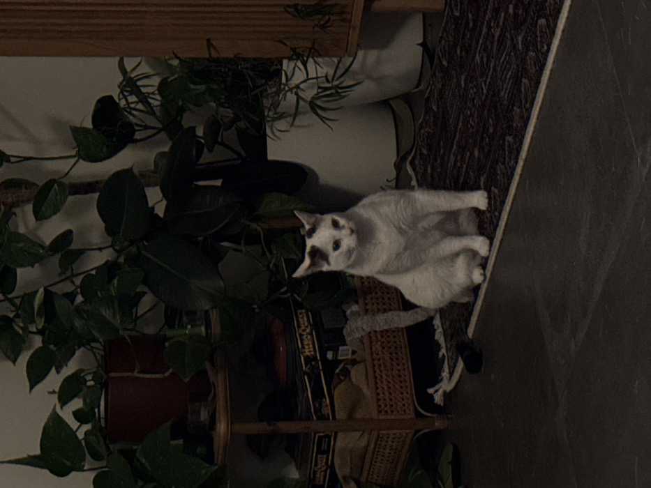 A white cat with brown markings sits on a patterned rug beside a plant in a brown pot. The plant sits on a wicker shelf in front of a wall. A board game box is visible on the shelf. A wooden cabinet is above the plant. The rug sits against a wall. The image is dimly lit.