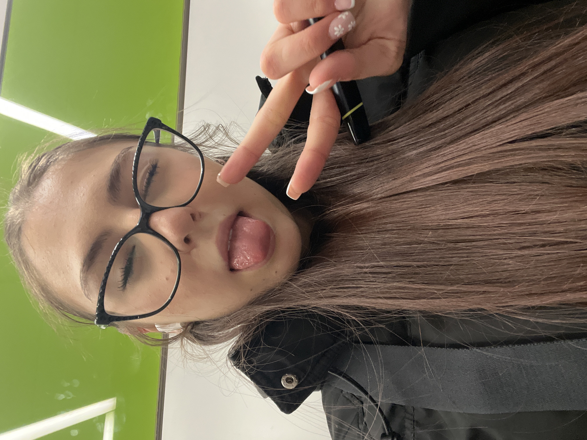 A young woman with light skin and light brown hair is sticking her tongue out and making a peace sign with her right hand. She is wearing black glasses and a dark jacket. The background is green and white. The location is Unknown, Unknown.