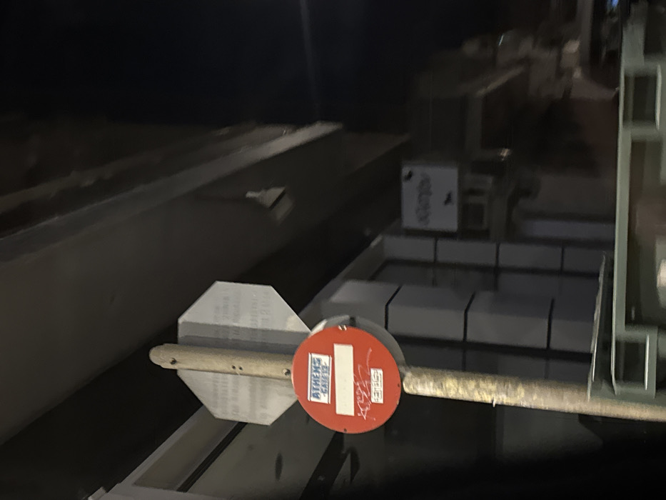 A close-up shot depicts a metal structure with a small, round, red and white sign affixed to it. The sign reads "ATHENS SAFETY." A wooden stick extends from the sign, connecting to a hexagonal shape. The background reveals an industrial setting, possibly a factory or warehouse, with various metal components and structures visible. The lighting is dim.