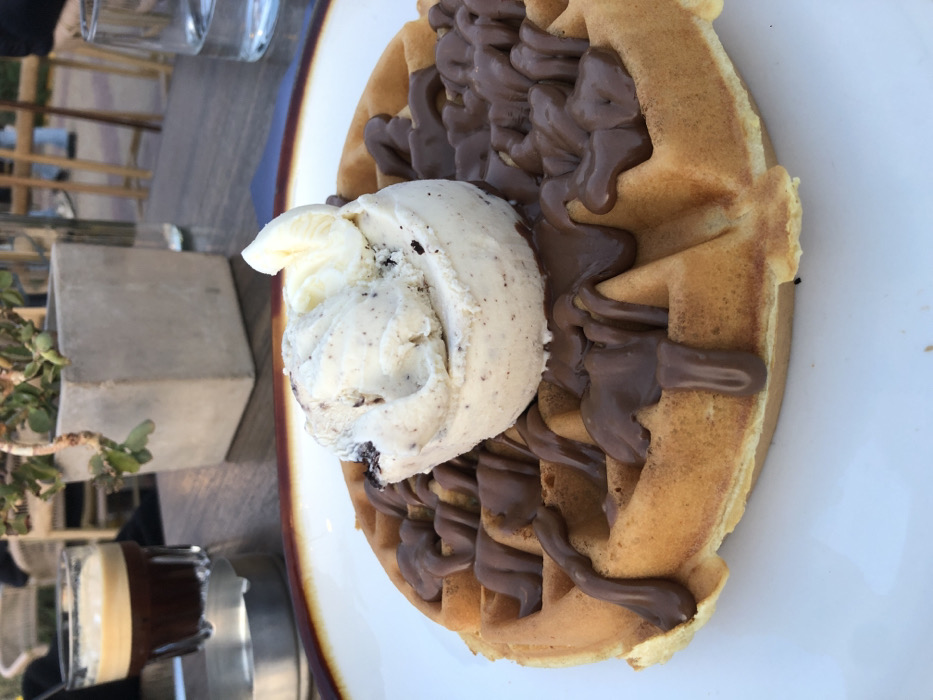 - "waffle drizzled with chocolate and topped with vanilla ice cream on a white plate" by FM-nSho83, licensed under CC BY 4.0