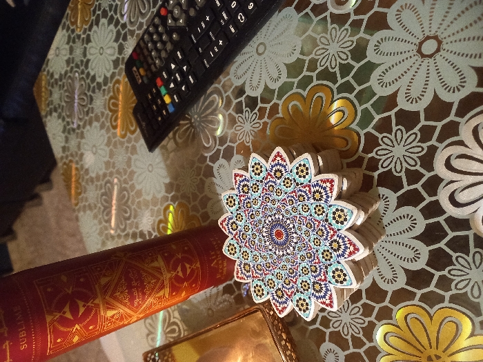 A high-angle shot reveals a table with a patterned surface, adorned with white and gold floral designs. A black remote control sits at the top. A red, cylindrical object with gold embellishments lies horizontally. A stack of circular, intricately patterned coasters is positioned near the center. A gold-toned, rectangular object rests beneath the red cylinder.
