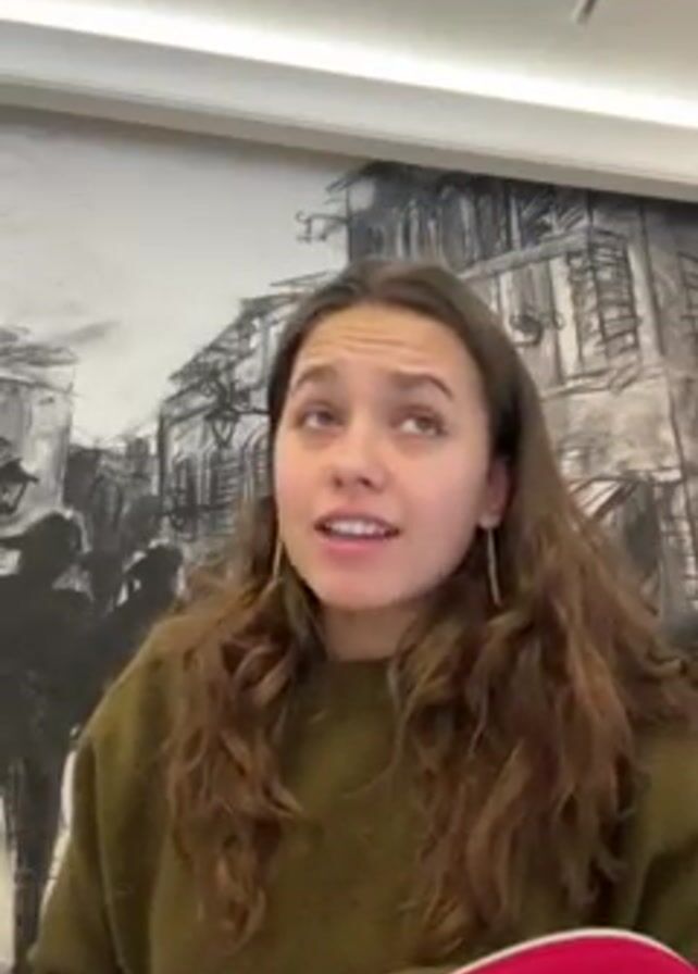 woman with long, wavy brown hair and fair skin wearing a green sweater over a red undershirt. She is sitting indoors in front of a large black-and-white drawing depicting a European street scene. The woman holds up three lighters in her hands, which include one patterned with flowers, one that is yellow, and one that is purple. She states she has three lighters and does not have cigarettes.