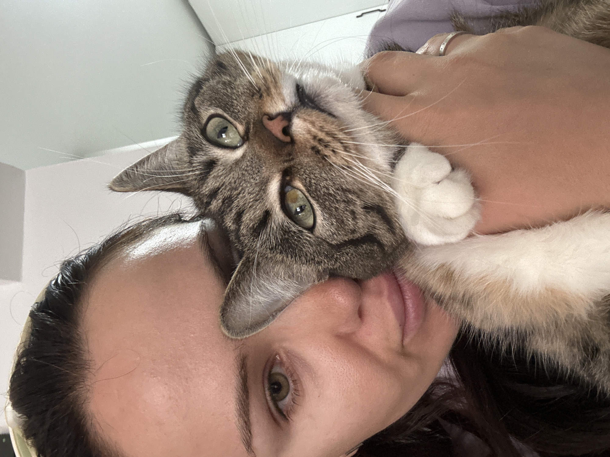 An indoor, close-up photograph features a female human subject holding a domestic cat. The female's face, with dark hair, fair skin, and a visible left green-brown eye, nose, and pink lips, occupies the left portion of the frame. Her right hand, wearing a silver ring on the ring finger, is positioned under the cat's chin, supporting it. The cat, a tabby with brown, grey, and white fur, green eyes, and a pink nose, is pressed against the female's face, looking towards the camera. Its white-furred left front paw, showing paw pads, rests on the female's arm. The female is wearing a light purple garment. The background is a plain, light-colored wall or ceiling. The specific location within the city of Belgrade, Serbia, is not discernible from the visual information provided.