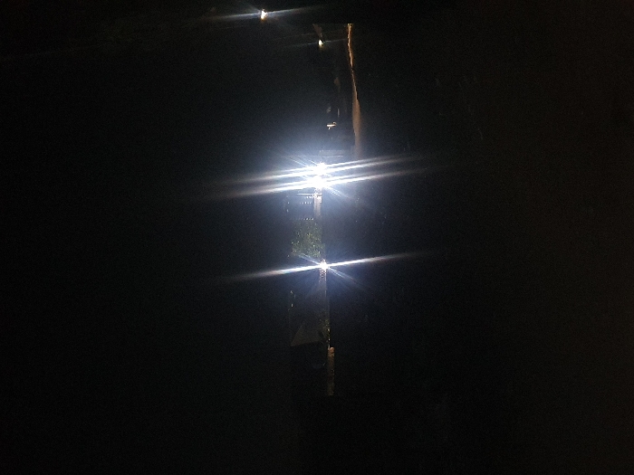 A dark, almost entirely black image is bisected vertically by a line of intense light. The light source, seemingly from a series of streetlights, is obscured, with the bright glow dominating the center. Hints of green vegetation are visible near the lower light source. Barely discernible structures appear behind the light. The surrounding area is enveloped in darkness, obscuring detail.