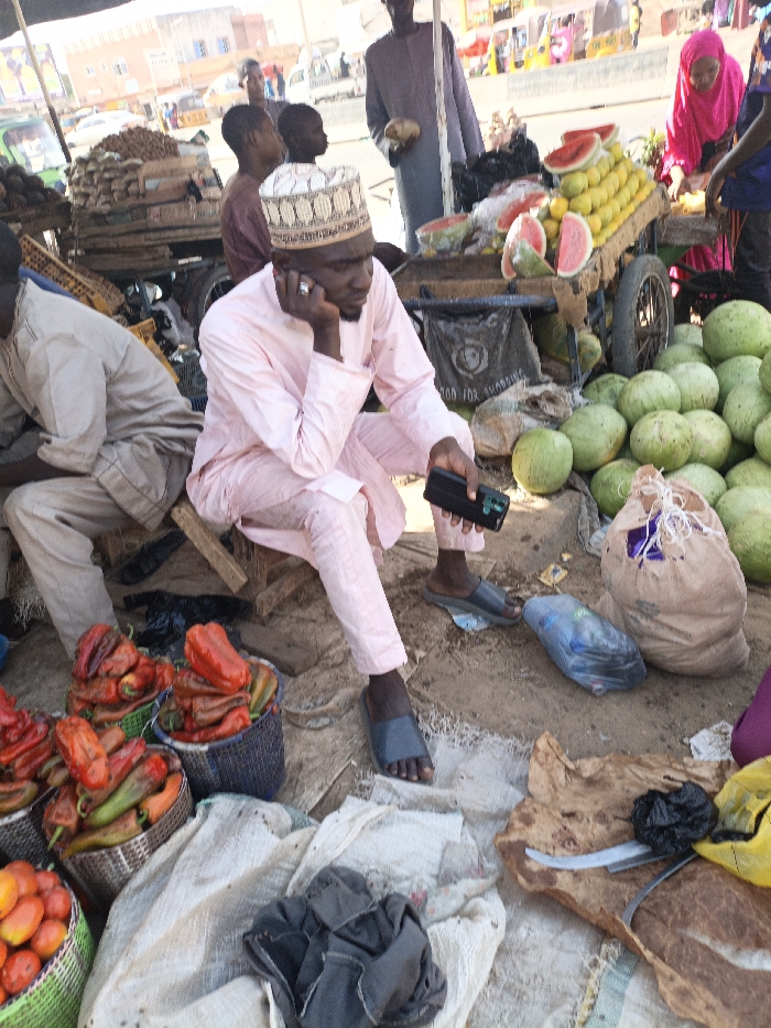 The image captures an outdoor market scene in Kawaji, Nigeria, under bright natural daylight. In the central foreground, a man wearing a light pink long-sleeved tunic (kaftan), matching trousers, and a patterned white and brown cap (kufi) is seated on a low wooden stool. He holds a black smartphone in his left hand and rests his right hand, adorned with a silver ring on the ring finger, against his chin. He wears blue-grey slides. To his immediate left, another man in a light brown traditional garment is partially visible, also seated on a similar stool. To the left of the central man, multiple woven baskets are filled with red and green bell peppers and chili peppers. A green woven basket containing red-orange tomatoes or similar fruit is partially visible in the bottom-left corner. To the right of the central man, a large pile of whole, green watermelons rests directly on the unpaved, reddish-brown earth. Adjacent to the watermelons is a large, light brown sack tied at the top and a clear plastic bag containing several plastic bottles. A large metallic blade is visible on a brown mat on the ground in the bottom-right. In the mid-ground, a wooden cart with wheels displays produce, including several cut watermelons revealing red flesh, and a structured arrangement of whole yellow melons. A black cloth bag with white text hangs from the cart's structure. In the background, a woman wearing a bright pink hijab and a dark blue top is partially visible near a stall. Several other individuals, including two partially obscured children, populate the scene. The distant background features a busy street with vehicles and multi-story, light-colored buildings under a clear sky.