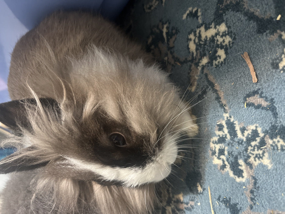 A close-up, angled shot reveals a fluffy rabbit with a white face and dark markings around its eyes. The fur on its body appears to be a mix of grey and brown shades. Long, thin whiskers extend from its face. The rabbit rests on a patterned rug, primarily blue and grey. A small, dark twig or piece of debris is visible near the rabbit on the rug.