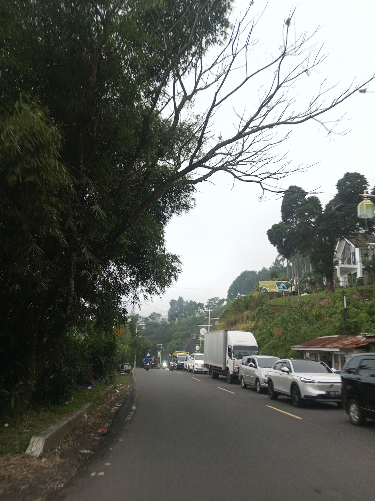 road in Mae Chan District, Thailand, lined with dense vegetation on the left and a hillside on the right. A line of vehicles, including cars, a truck, and motorcycles, is stopped on the road. The sky is overcast. A building with a distinctive tower is visible on the hillside.