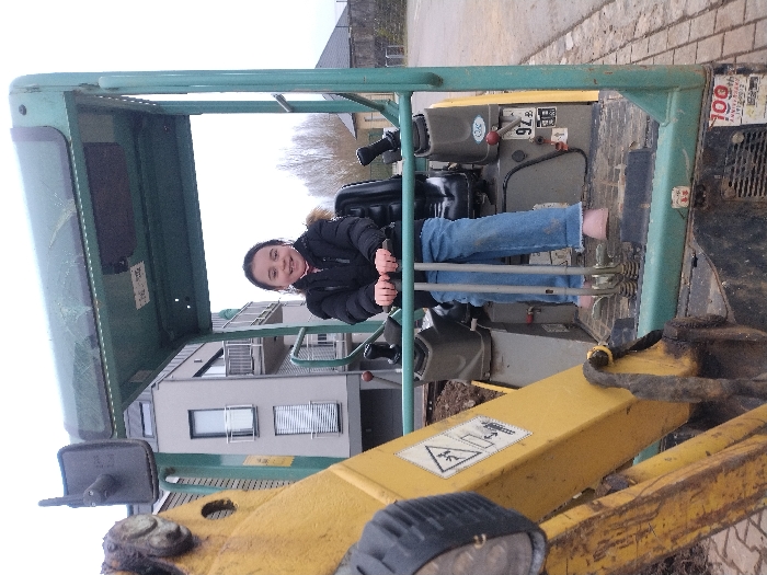 A young girl sits in the driver's seat of a construction vehicle, likely a small excavator