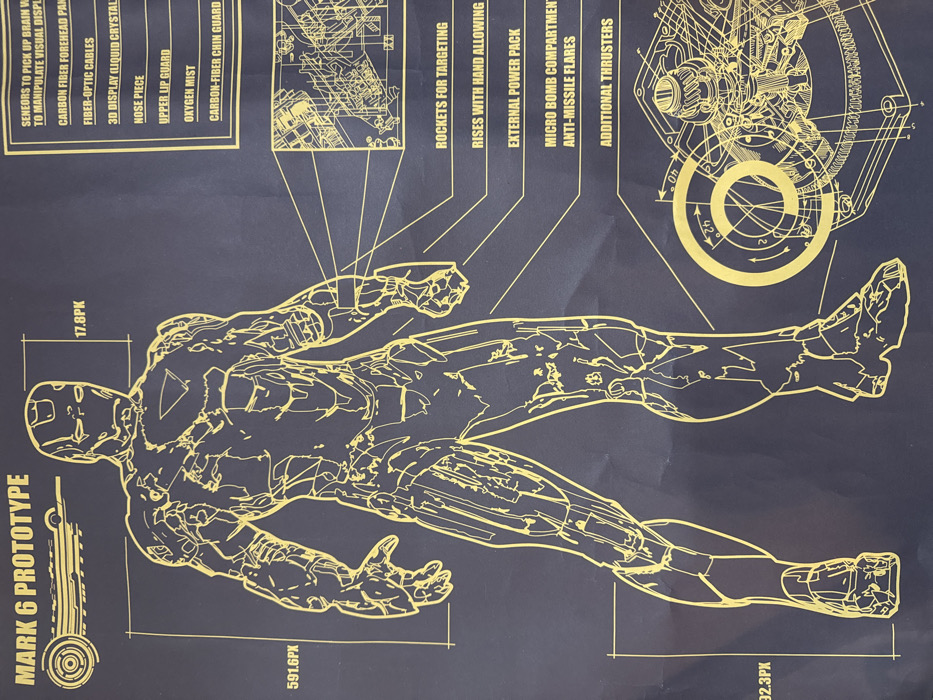 The image depicts a technical blueprint of Iron Man's Mark 6 prototype