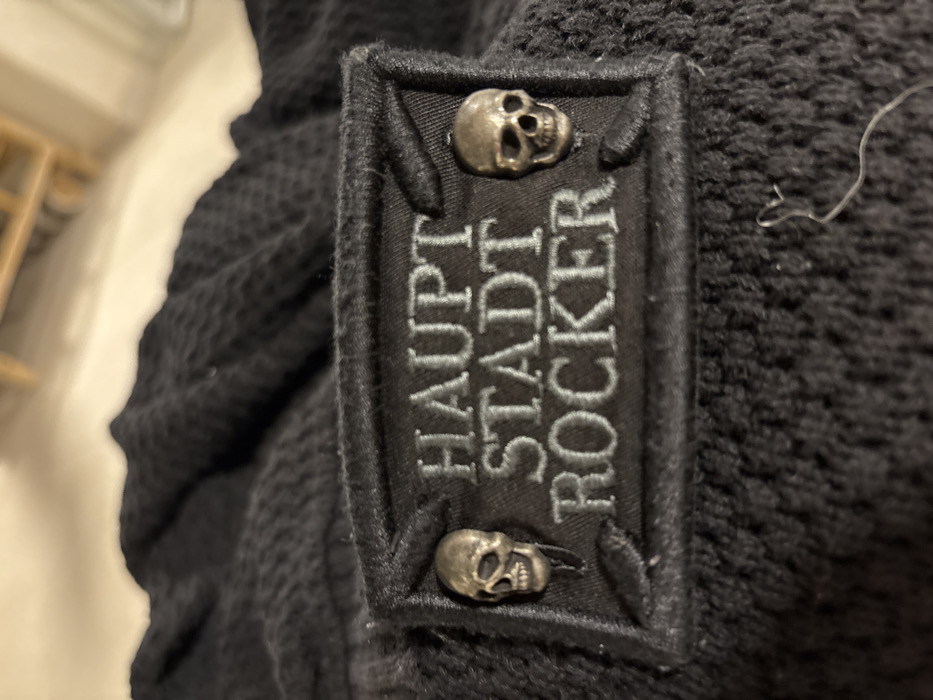 The image displays a close-up view of a black garment, likely textile, featuring a textured pattern resembling a waffle knit or weave. Centrally positioned on this fabric is a rectangular black patch with a distinct stitched border. The patch contains light gray embroidered text in three lines: "HAUPT", "STADT", and "ROCKER". Flanking the embroidered text on both the left and right sides of the patch are small, metallic skull-shaped studs. A single light-colored thread forms a small loop on the black garment below the patch, located in the lower-right foreground. The background is out of focus, revealing blurred light-colored surfaces and indistinct wooden elements, indicating an indoor setting. No individuals are present in the frame. The scene is located in the city of Tel Aviv, Israel.