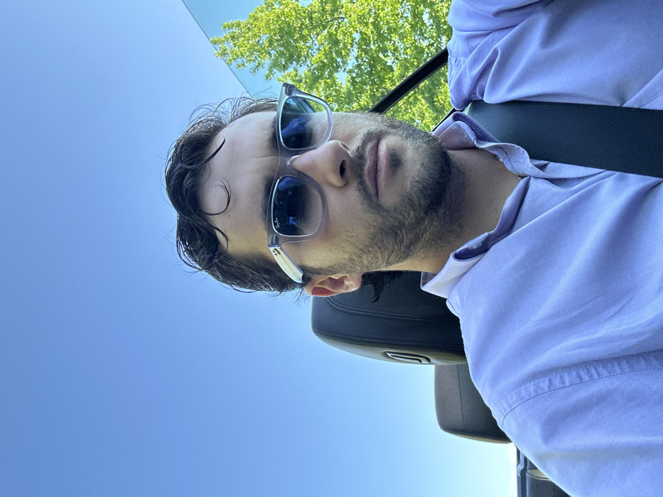 An image taken in Lo Barnechea, Chile, depicts a male individual from the chest up, seated in what appears to be a convertible vehicle on a clear day